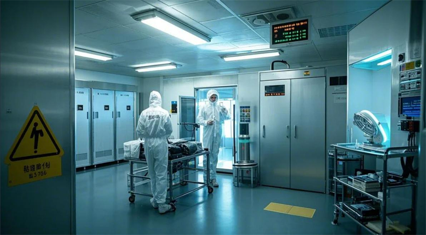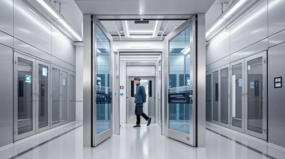 半導(dǎo)體晶圓廠(chǎng)潔凈車(chē)間,工業(yè)級(jí)無(wú)塵環(huán)境設(shè)計(jì)。更衣區(qū)設(shè)置環(huán)氧樹(shù)脂自流平地坪,墻面嵌入正壓送風(fēng)百葉,紫外線(xiàn)消毒衣柜線(xiàn)性排列。風(fēng)淋通道配備360度旋轉(zhuǎn)氣流噴嘴,頂部