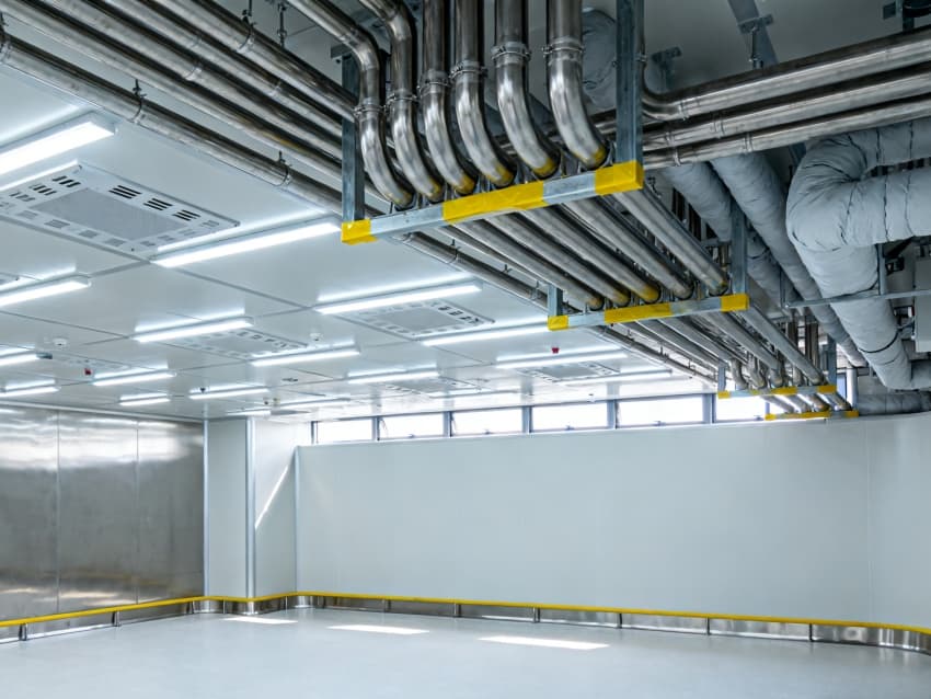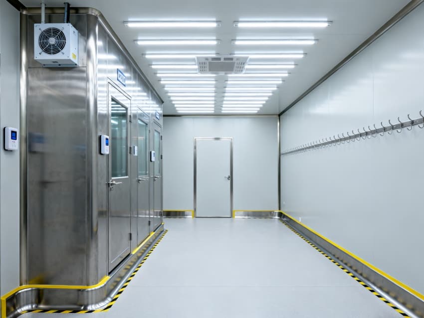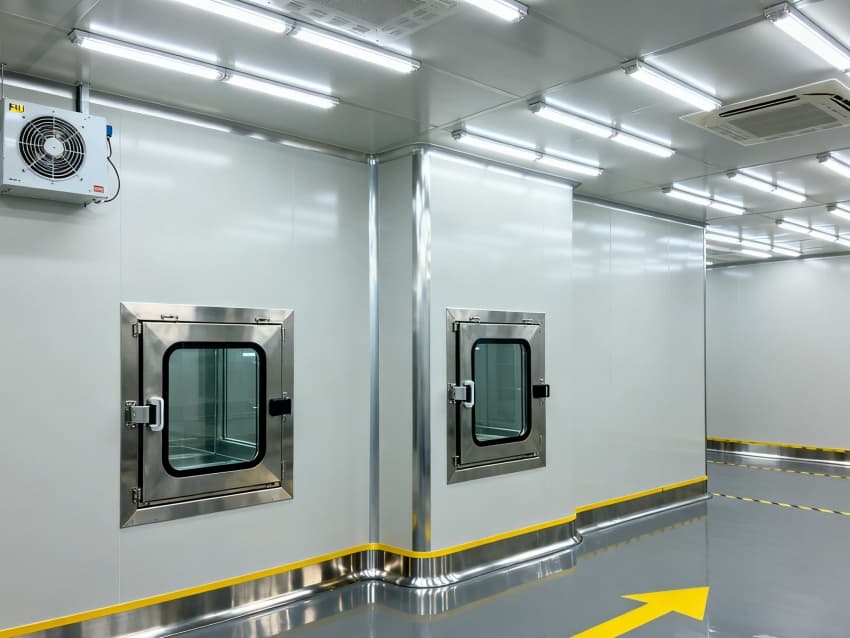 內部按芯片工藝流程劃分光刻輔助區、晶圓預處理區、封裝過渡區等,各區域通過無塵傳遞艙銜接。車間嚴格執行萬級潔凈標準(ISO8級),每立方米空氣中≥0.5μm微粒數≤352000個,采用初效-中效-高效-化學過濾四級凈化系統,配合垂直層流送風,每小時空氣置換25-30次。墻面為防靜電不銹鋼板,地面是環氧樹脂自流平材質,溫度穩定在23±1℃、濕度45±3%RH,同時配備靜電消除裝置,避免微粒與靜電影響芯片良率,完全契合芯片生產嚴苛要求。
