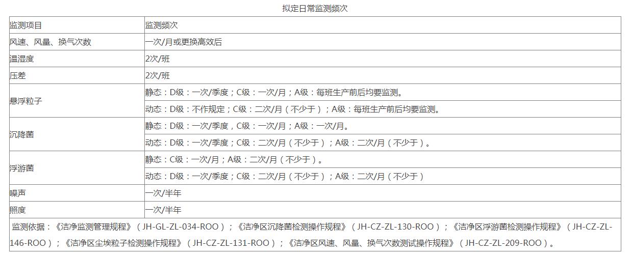 監測依據:《潔凈監測管理規程》(JH-GL-ZL-034-ROO);《潔凈區沉降菌檢測操作規程》(JH-CZ-ZL-130-ROO);《潔凈區浮游菌檢測操作規程》(JH-CZ-ZL-146-ROO);《潔凈區塵埃粒子檢測操作規程》(JH-CZ-ZL-131-ROO);《潔凈區風速、風量、換氣次數測試操作規程》(JH-CZ-ZL-209-ROO)。
