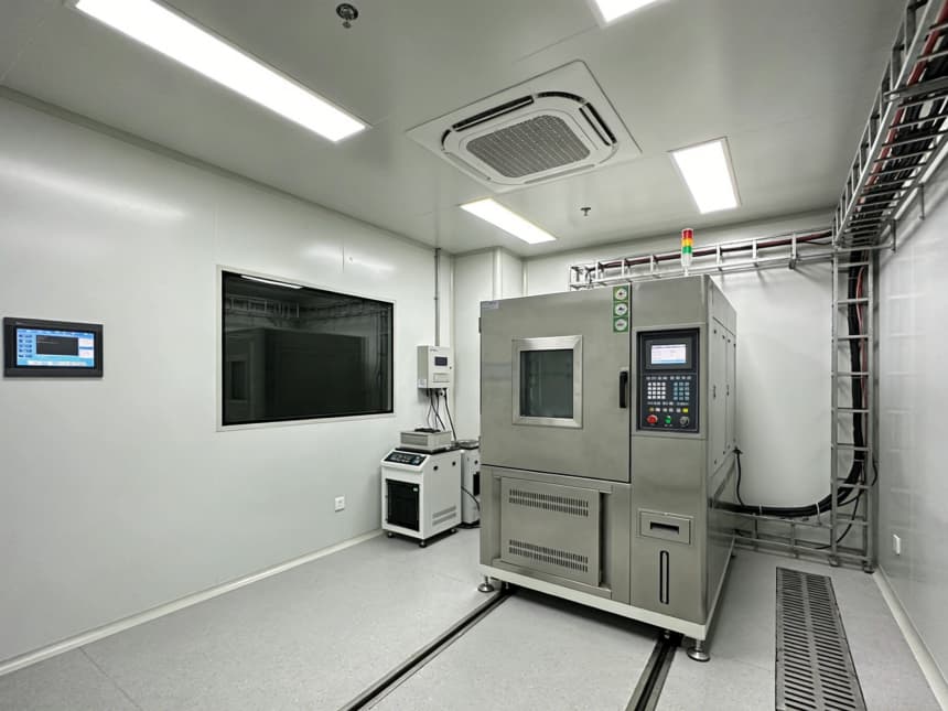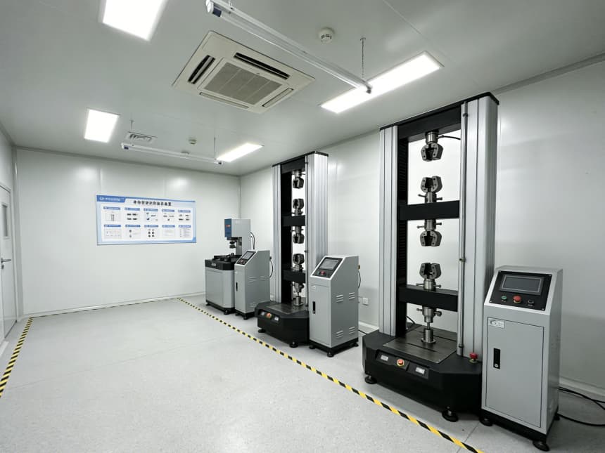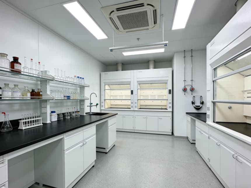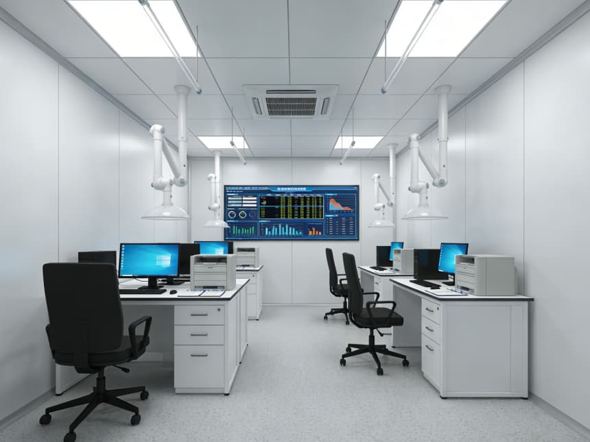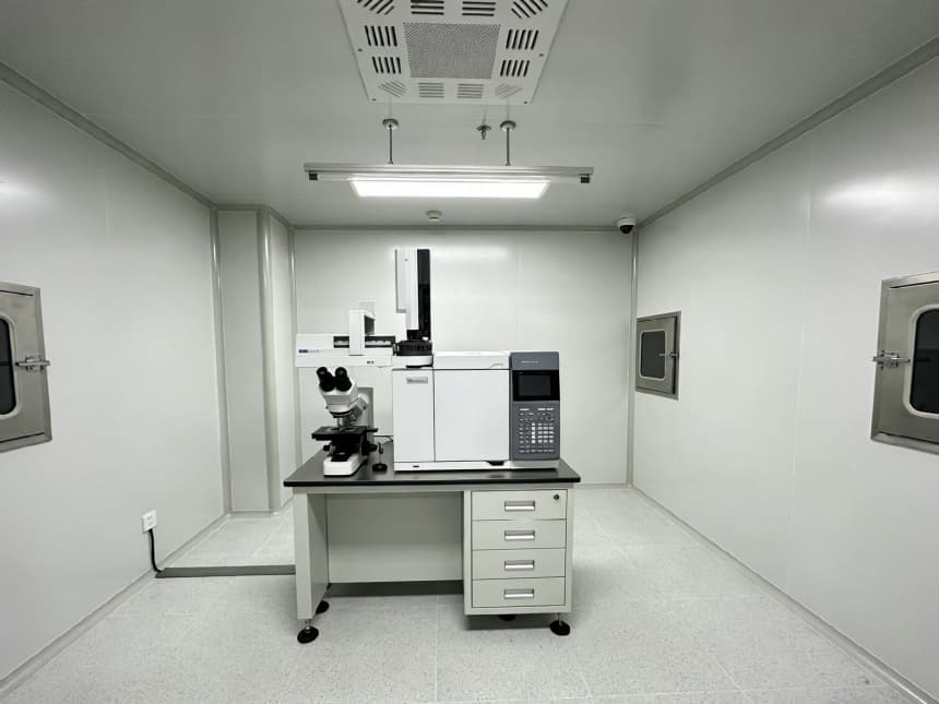 內部檢測空間均以淺灰色耐磨地坪搭配白色無縫潔凈墻面,視覺整潔且適配檢測核心需求。淺灰色地面選用高硬度環氧材質,抗壓耐磨、抗污易清潔,可耐受檢測過程中各類試劑殘留與設備搬運磨損;白色墻面采用環??咕繉?,平整度高、反光均勻,搭配嵌入式防眩光照明,為精密檢測提供清晰穩定的視覺環境,減少誤差干擾。