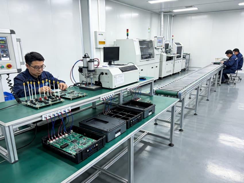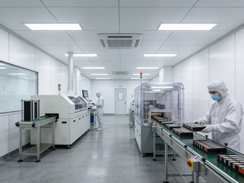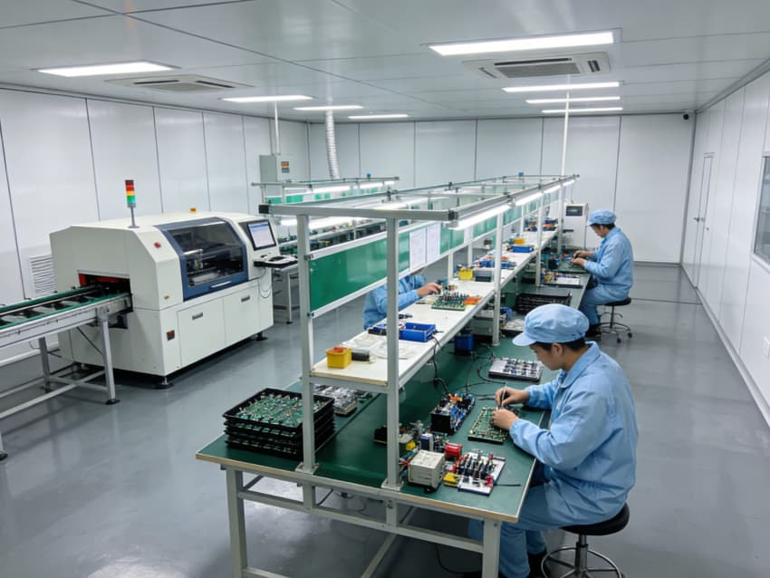 手工組裝與測試區:采用模塊化防靜電工作臺布局,每個工位配備獨立電源接口與靜電手環接地端,線性燈帶提供均勻照明,旁側通風系統有效驅散焊接產生的熱量與煙塵。