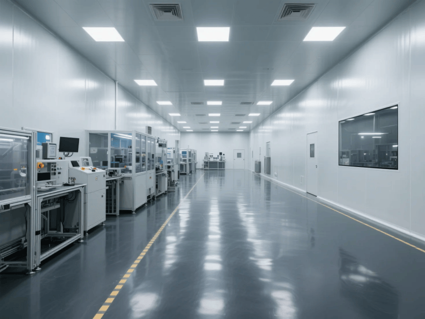 本工程嚴格遵循ISO14644-1Class6標準,專為高精度激光器件鍍膜工藝打造專業(yè)潔凈生產(chǎn)環(huán)境。整體采用啞白彩鋼板墻體與深灰防靜電環(huán)氧地坪的極簡工業(yè)配色,營造精準、穩(wěn)定的光學器件生產(chǎn)空間。