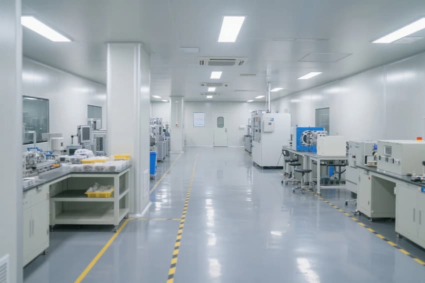 本工程嚴(yán)格遵循ISO14644-1Class7及GMP醫(yī)療器械生產(chǎn)規(guī)范,打造高標(biāo)準(zhǔn)的生物醫(yī)療器械制造環(huán)境。車間采用醫(yī)療級(jí)白色抗菌彩鋼板與淺藍(lán)防靜電環(huán)氧地坪的潔凈配色方