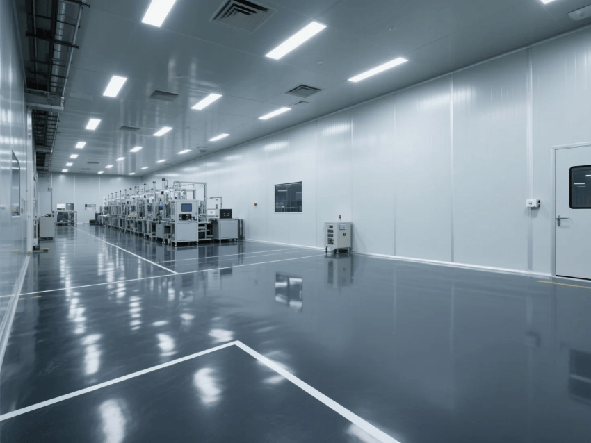 本工程嚴(yán)格遵循ISO14644-1Class6標(biāo)準(zhǔn),專為高精度激光器件鍍膜工藝打造專業(yè)潔凈生產(chǎn)環(huán)境。整體采用啞白彩鋼板墻體與深灰防靜電環(huán)氧地坪的極簡(jiǎn)工業(yè)配色,營(yíng)造精準(zhǔn)