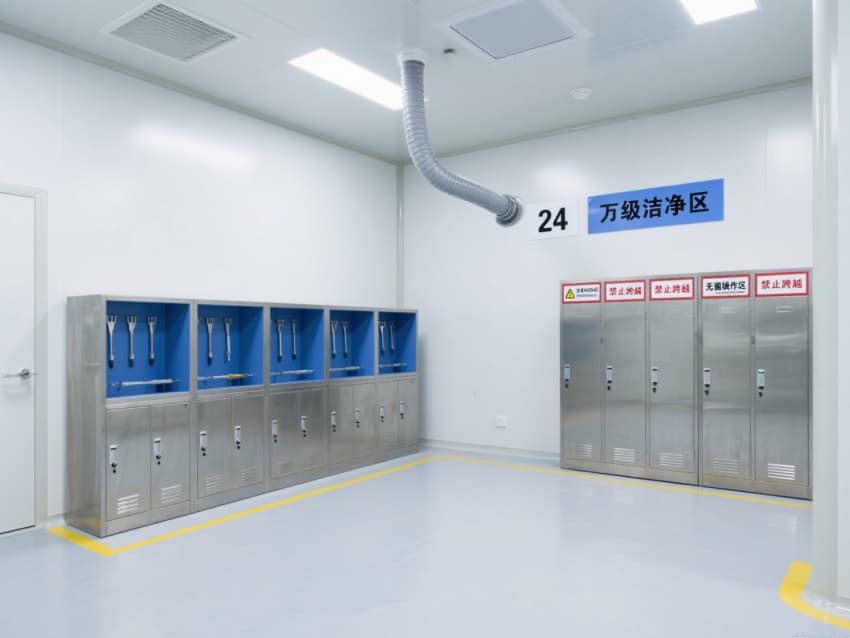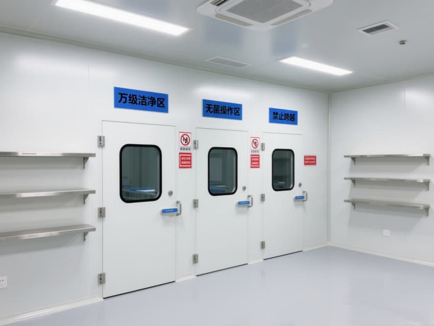 空間內(nèi)配備不銹鋼潔凈門窗與雙扉傳遞窗,均采用高氣密性密封結(jié)構;嵌入式LED潔凈燈提供300-500lux均勻照明,無眩光設計保障操作精度。恒溫恒濕系統(tǒng)精準控制溫度(20-24℃)、濕度(45-60%),藍色功能標識線清晰劃分操作動線,全方位營造安全、穩(wěn)定的萬級無菌環(huán)境。