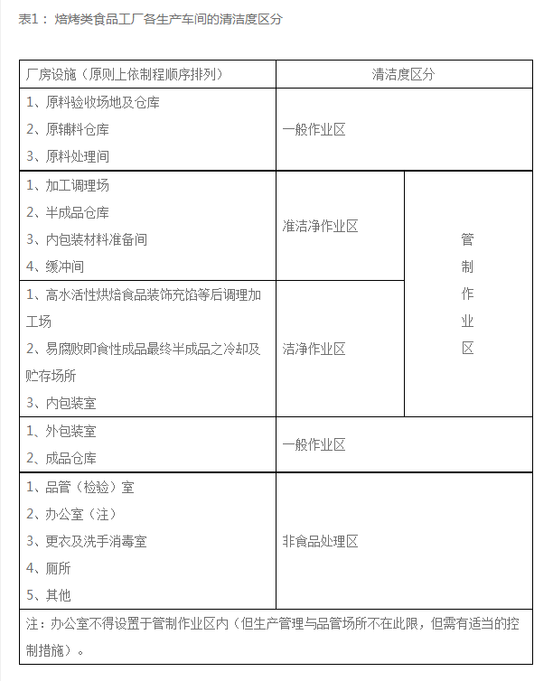 表1: 焙烤類食品工廠各生產(chǎn)車間的清潔度區(qū)分