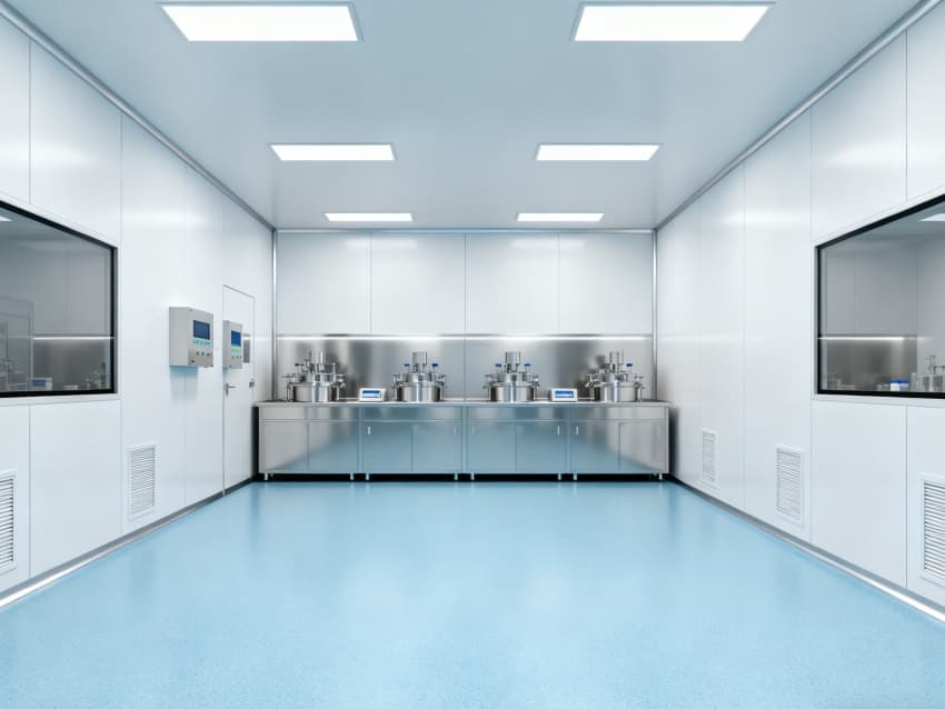 在環(huán)境控制層面,本設(shè)計(jì)彰顯卓越優(yōu)勢(shì):地面選用淺藍(lán)色防滑防腐蝕環(huán)氧材料,不僅具備優(yōu)異的抗藥劑侵蝕性能,而且清潔消毒極為便捷;四周白色抗菌墻面采用圓弧轉(zhuǎn)角工藝,有效規(guī)避粉塵積聚風(fēng)險(xiǎn),搭配全吊頂潔凈送風(fēng)系統(tǒng),可將潔凈度穩(wěn)定維持在萬級(jí)標(biāo)準(zhǔn),精準(zhǔn)契合藥劑生產(chǎn)對(duì)微環(huán)境的嚴(yán)苛需求。?