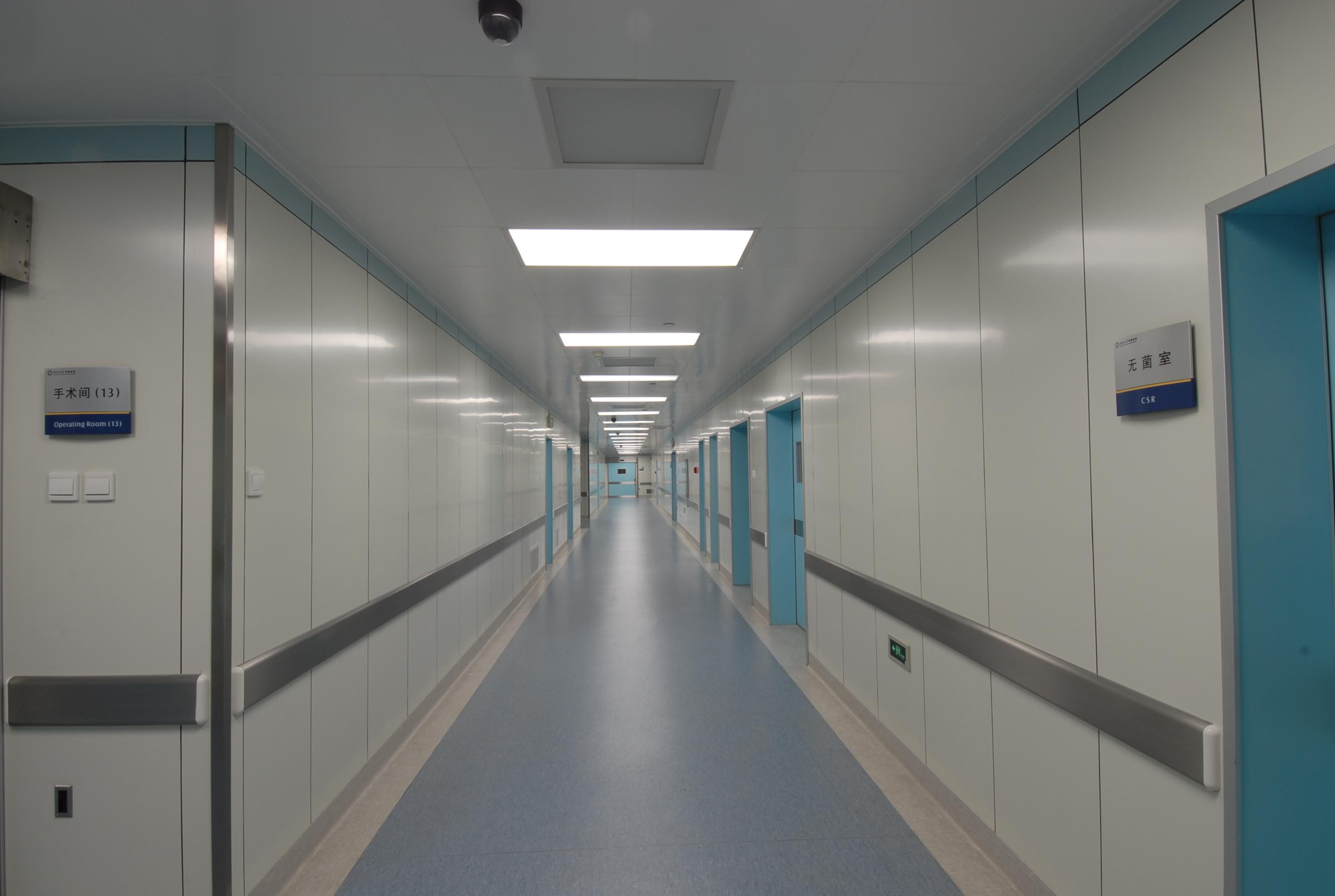 手術部墻體及吊頂均采用防菌50系列夾芯彩鋼隔熱板,企口型,厚度為0.426mm,雙面貼膜,潔凈手術室墻面必須達到無縫、氣密效果,色彩符合現代手術室的要求,視覺感觀舒適。潔凈走廊加裝200mm寬厚度為0.8mm不銹鋼防撞帶。